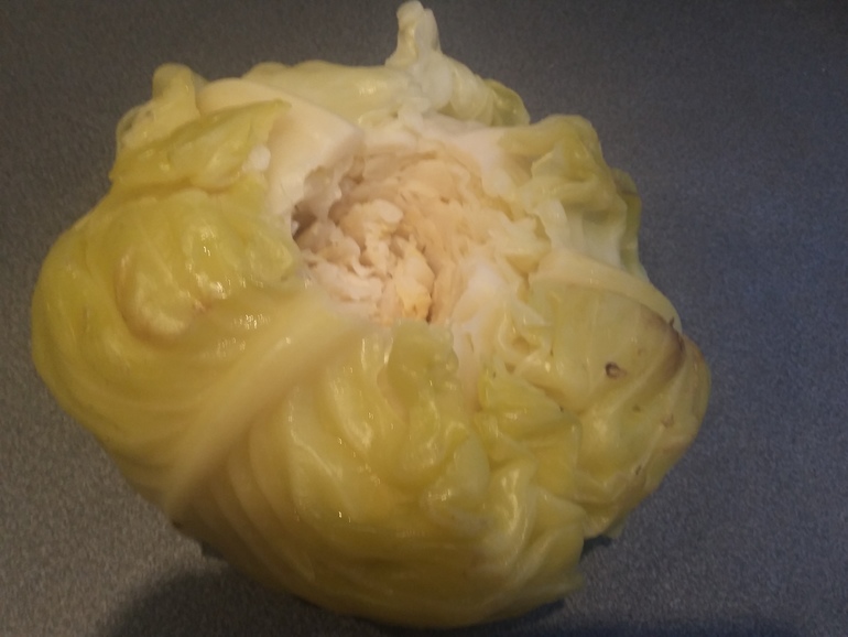 Закрыть крышкой, минут через 10 перевернуть кочан кочерыжкой вниз, вскипятить и выключить. Остудить в кастрюле (я на начь так делаю). Вытащить кочан, перевернуть, дать стечь воде: