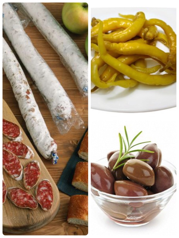 Закуски: колбаса фуэт, оливки, маринованный перчик и маринованные корнишоны и черри.