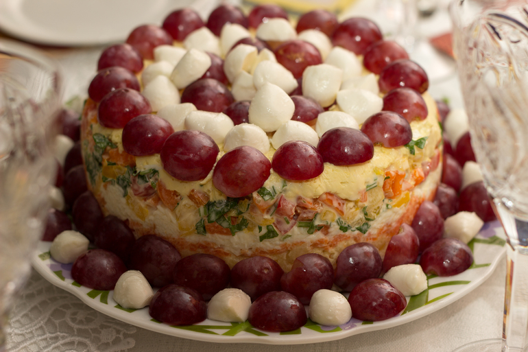 И оставляем салатна ночь, перед подачей на стол переворачиваем салат на тарелку, убираем пленку и украшаем салат половинками винограда и моцареллы. Приятного аппетита.