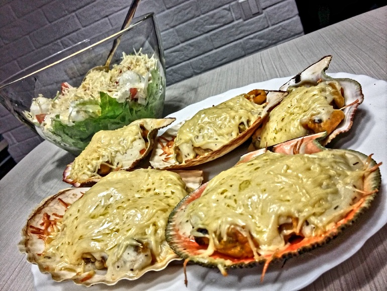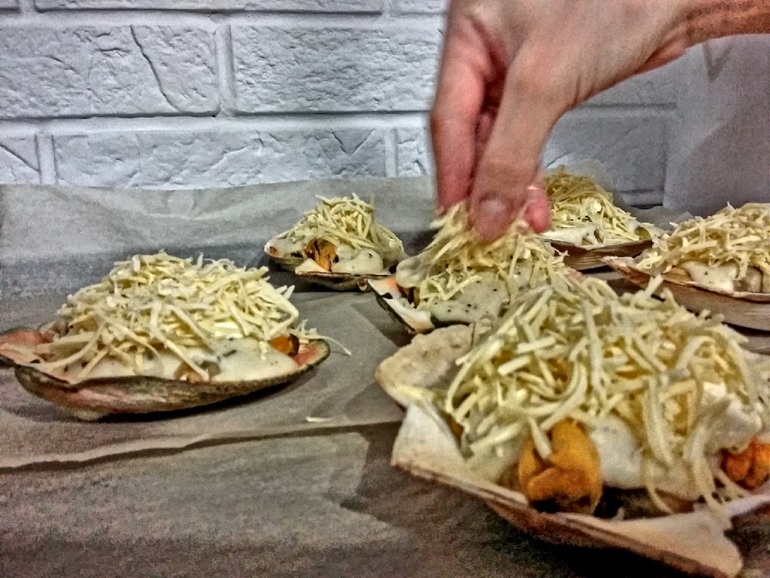 Гребешки выкладываем в небольшие формочки для гратена (у меня были раковины от гребешков).