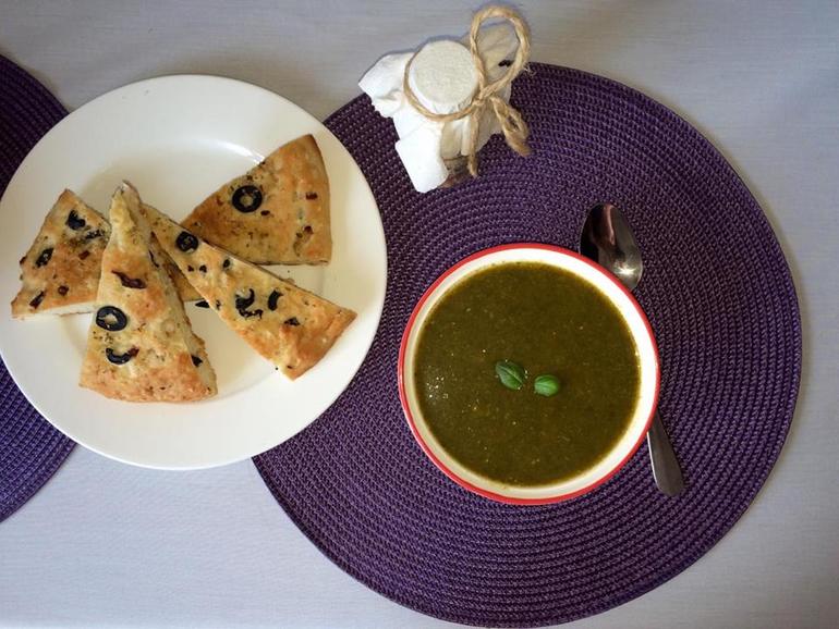 После первой ложки супа М поменялся в лице, но потом вошел во вкус. Что может быть лучше шпинатного супчика?!!Только шпинатный супчик с такой вот лепешечкой.
