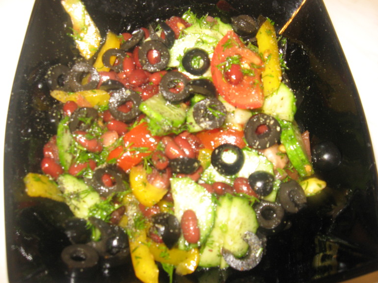 идеально вписываются в эту компанию овощей: маринованные кольца красного лука, или белый салатный лук, чеснок, можно натереть им салатник для аромата ( т.к. беру с ссобойку на работу, то без лука и чеснока)