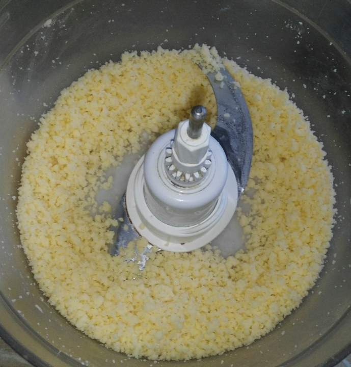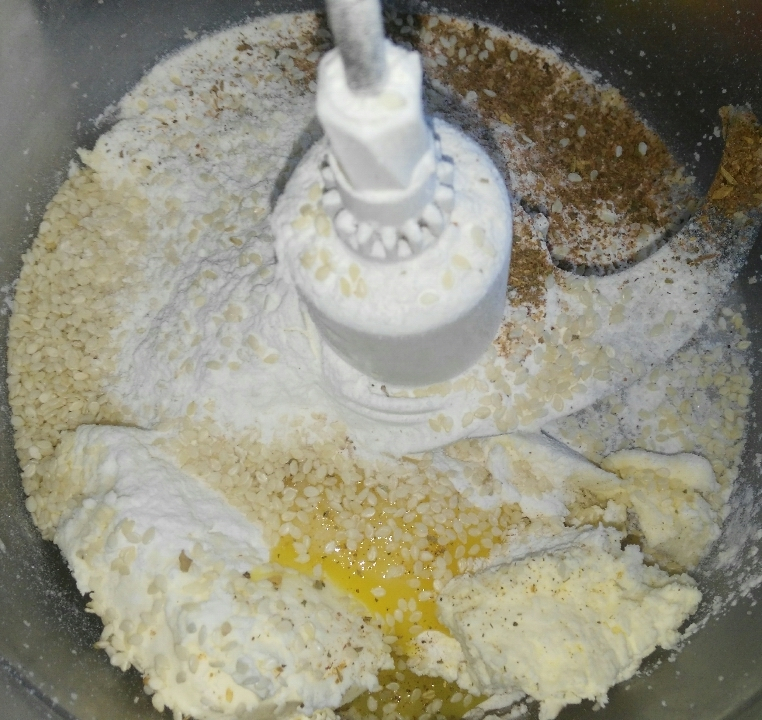 Холодное масло с мукой и желтком размешайте. На этом этапе в тесто можно добавить кунжут и специи, если хочется.