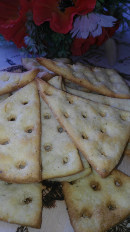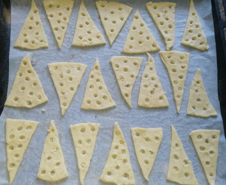 Раскатайте тесто в круг, сделайте в нём отверстия с помощью трубочки и разрежьте на аккуратные треугольные кусочки.