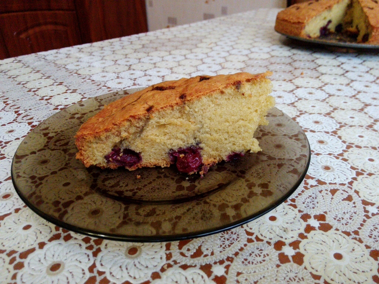 Взбит размягченное сл.масло с сахаром, дабавить 3 ст.л. муки, влить взбитые яйца и хорошо все взбить. Затем постепенно всыпать оставшуюся муку ( за 2 раза), разрыхлитель до консистенции густой сметаны. В смазанную форму вылить тесто, сверху положить вишни. Выпекать 40 мин. при t 180° С.