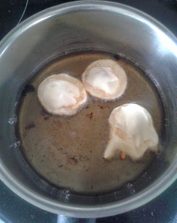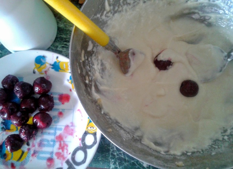 В тесто кидаем замороженную вишню и ложками обваливаем в тесте и по одной кидаем в масло.