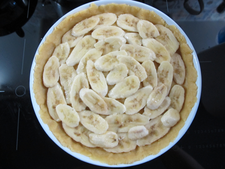 Далее распределяем руками тесто по форме, раскладываем бананы и смазываем все сметаной. Отправляем в предварительно нагретую духовку до 200 гр на 20 минут.