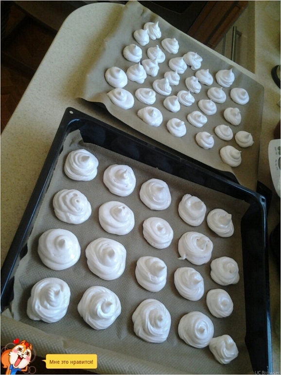 Тепеь быстро сооружаем бооольшой кондитерский мешок, у меня фискарс был он очень маленький даже класть в него не удобно, я взялв большой пакет для заморозки, он плотгый и не рвется, пакетики для завтраков не пойдут порвутся.в общем отсадить на все имеющиеся протвини на бумагу или коврики силиконрвые красивые безешки:-) мне надо упорно и долго тренироваться поэтому как есть:-) оставить при комнатной температуре минимум на 5 часов потом пудрой присыпать и через сутки говорят модно есть, мы еще не пробовали, но по виду они уде подстывают, ттт:-)