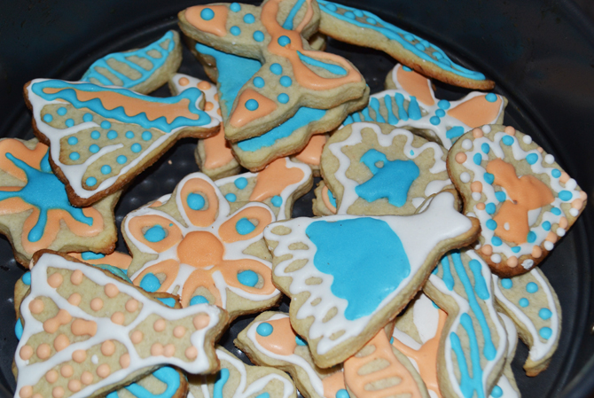 часть раскатать,я это делаю между листами пергамента для выпечки.Затем сделать формочки и выпекать при 180 градусах 6-10 мин.Зависит от духовки.Они получаются бледненькие,не очень красивые,но ровные и хорошо держат форму.Потом остудить и украсить айсингом.
