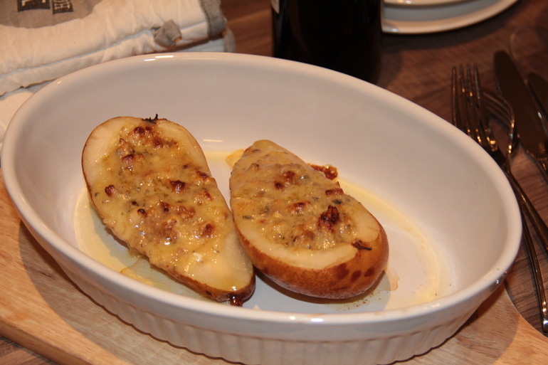 Сыр мешаем с медом и рубленными грецкими орехами. Наполняем груши. 180 градусов, примерно 15 минут. Подается теплым, одна штук на человека.