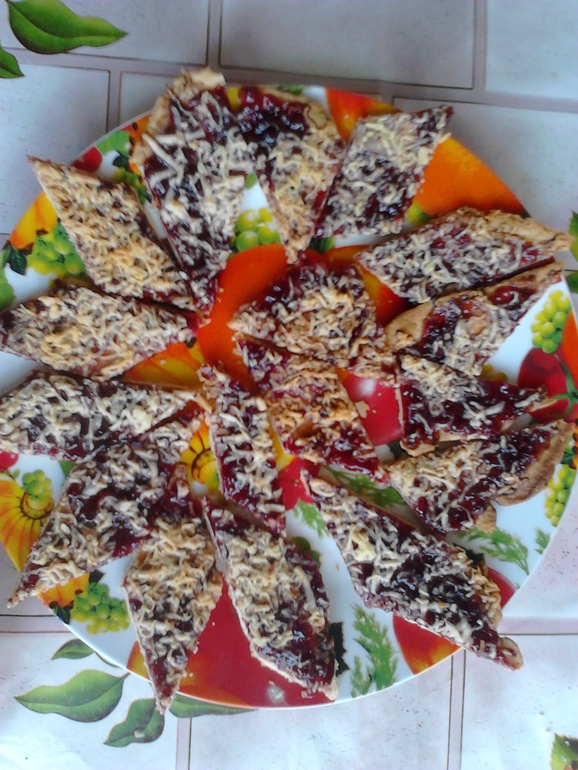 По истечении часа большую часть раскатать на протвени,сделать проколы вилкой и смазать джемом,сверху потереть кусок из морозильники и поставить в разогретую духовку на 30 минут,может меньше я смотрю внешне как оно. Затем режим на ромбики и готово!