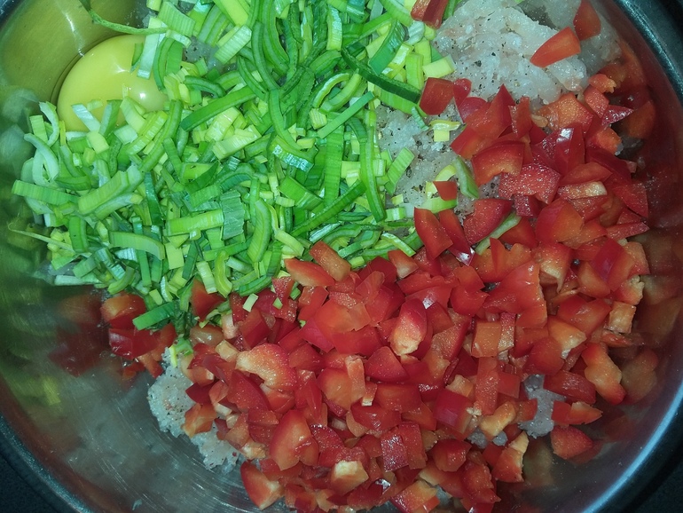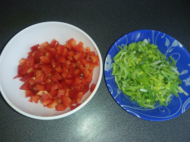 Остатки болгарского перца и лук порей мелко порезать: