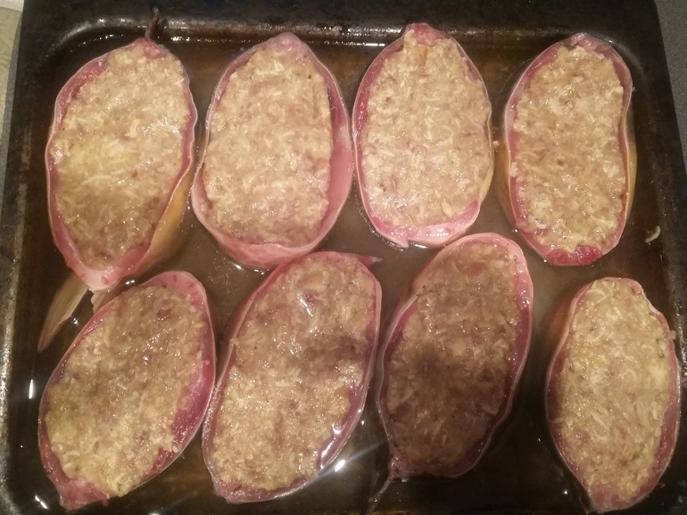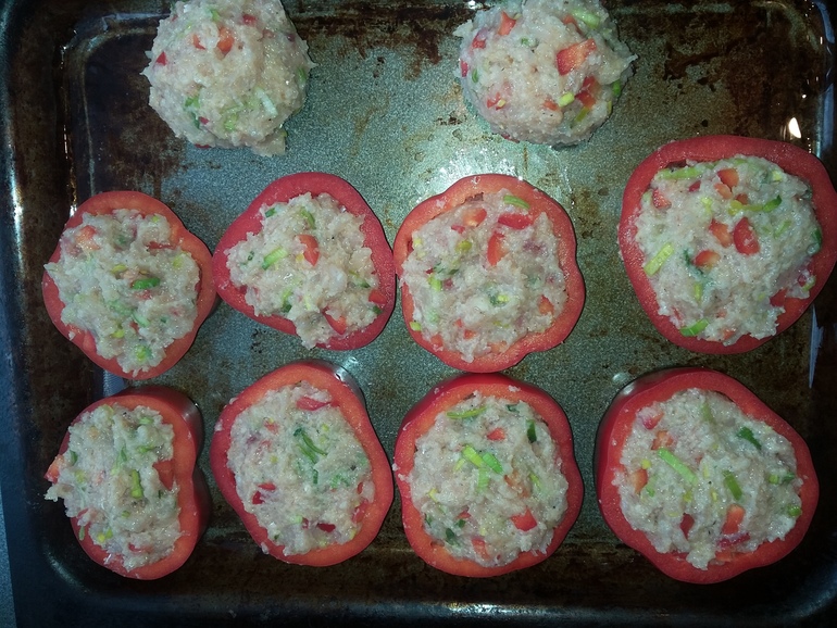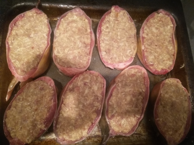 Плотно набить кольца фаршем: