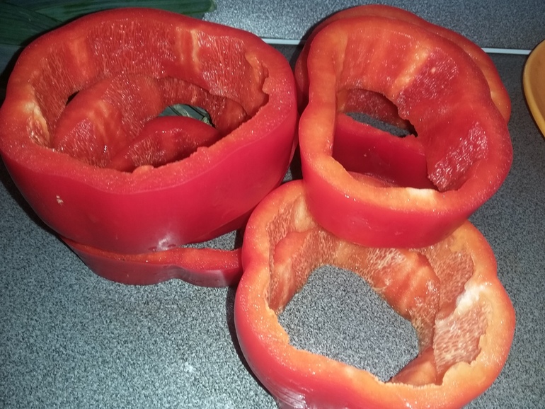 Болгарский перец помыть, почистить, нарезать кольцами по 2 см: