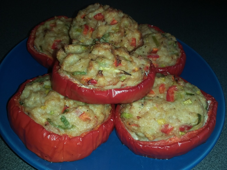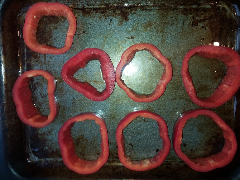 Противень смазать растительным маслом, разложить кольца перца: