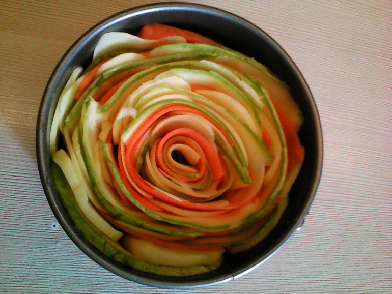 Нарезала слайсером кабачок, морковь и мелкий картофель (как люди им режут? у меня все руки ободраны). Выложила в формочку. Хотела потом залить сыром с травами, достала на стол оставшийся кусочек, но брательник заграбастал его себе на яичницу :'(. Сверху полила нежирной сметаной (в следующий раз предварительно "замариную" кусочки в сметане с травами) и поставила в духовку на 200С, по времени приблизительно 30 минут, хотя формочка небольшого диаметра.