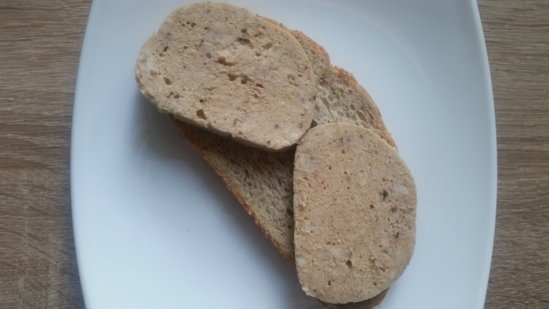 Из указанного количества ингредиентов получается 2 / 3 колбасы. Одну сразу приготовить, а остальные заморозить. Я и холодную ем и в микроволновке грею - и так и так вкусно. Режется отлично - не крошится.