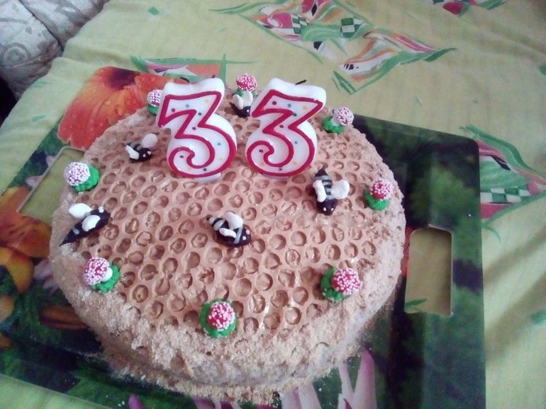 Делала медовик "пчелка". Получился просто сказочно вкусный,не сухой,сочный,муж был в восторге. На укрательства времени не было и материала тоже,это я про миндальные крылышки,украсили на скорую руку и пошли поздравлять. Наш папа отказался его гостям подавать,сказал что он все сам съест и все))) ест довольный третий день