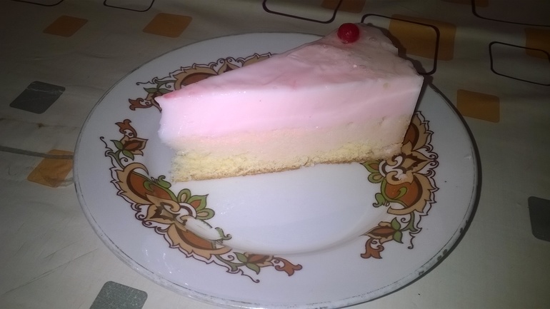 Второй тортик делала просто так. Корж-бисквит на кипятке. Йогуртовая часть: бутылка питьевого йогурта 800гр(у меня был клубничный), добавить немного сахара(по вкусу), желатин 40гр(количество зависит от качества желатина) замочить на 40-50 минут. Затем нагреть до полного растворения. Взбить слегка йогурт с сахаром, добавить желатин и фрукты-ягоды по желанию, залить сверху на бисквит и отправить в холодильник, лучше на ночь.