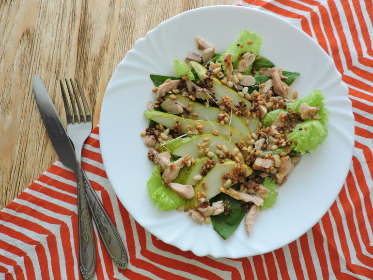 Тонкое сочетание вкусов красной рыбы и сладковатой груши, прекрасно оттеняемые салатными листьями и пророщенным зерном. Насыщенная вкусом меда и горчицы заправка, подружить которые поможет лимонный сок.