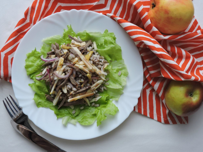 запеченная утиная грудка, перловка, листовой салат, красный лук, сыр "Мастер", яблоко сладкое. Мне посчастливилось, и грудка осталась от празднества, но ее вполне можно заменить любым не жирным мясом. В качестве заправки не острая горчица и гранатовый соус(заменяем на лимонный сок.