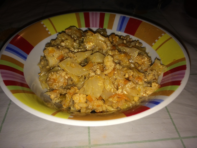 3. В это же время на сковороде обжарить лук на растительном масле, добавить морковку и капусту. Обжаривать около 15 минут.