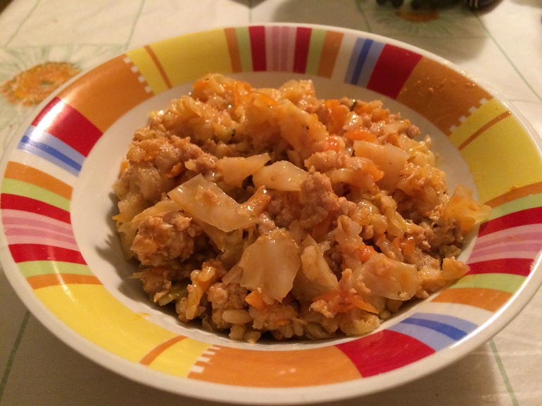 5. Добавить 1 стакан риса (мерный стаканчик для мультиварки), добавить соль, перец, приправу и кетчуп. Все перемешать добавить воды, примерно 1.5 стакана (обычных)))).