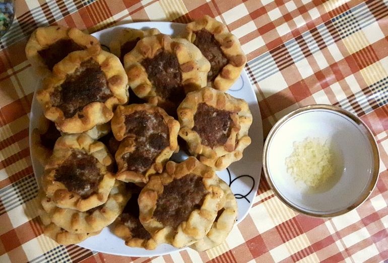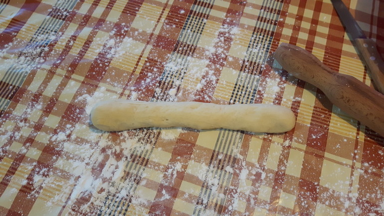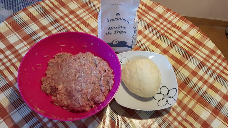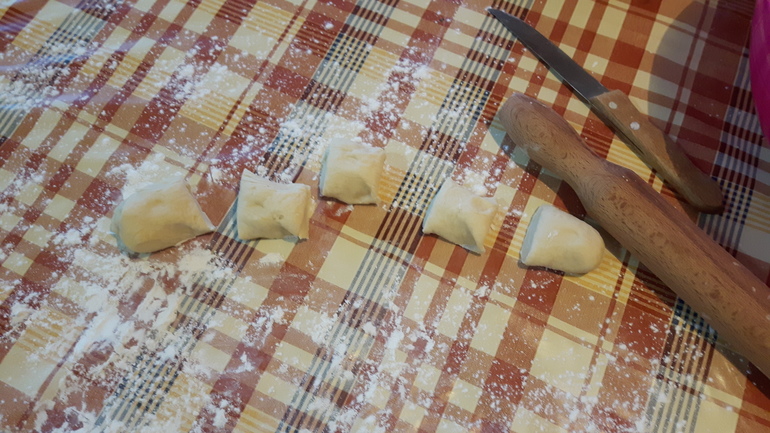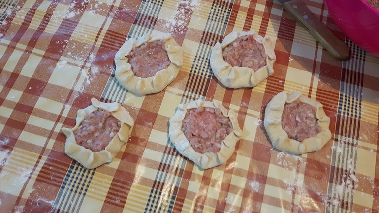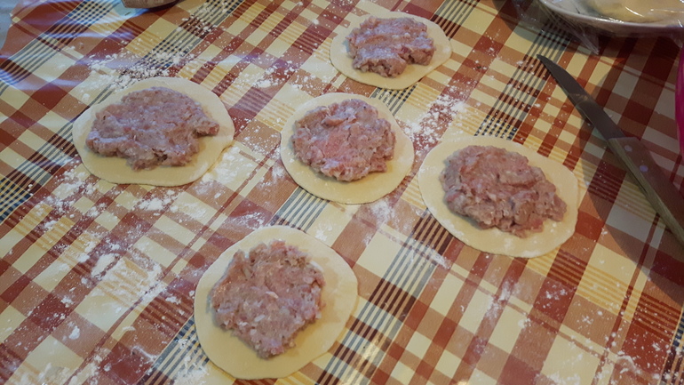 дальше начинаем лепить..отрезать от теста примерно 1/5 часть и делаем колбаску...потом режем примерно на 5 кусочков и раскатываем их...потом кладем в серединку фарш и залепливаем по краям заворачивая мясо..