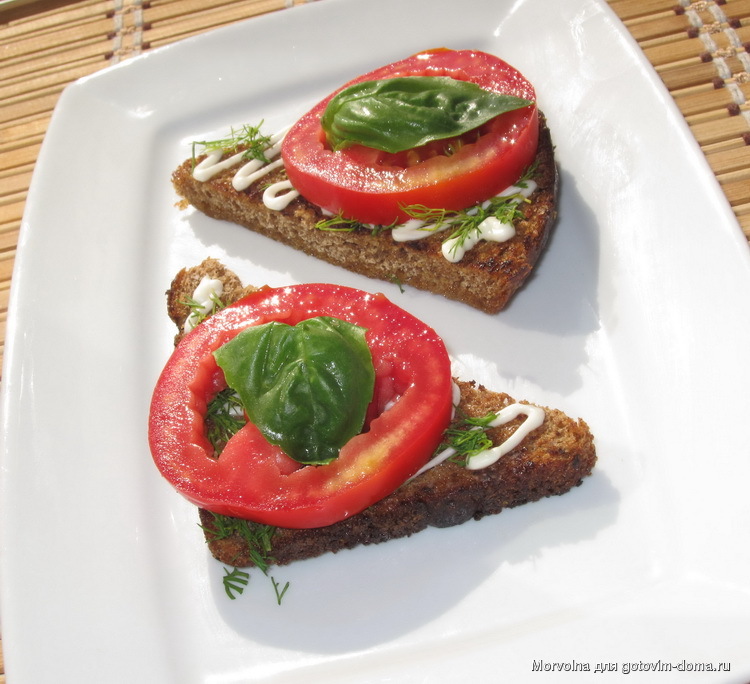 Хлеб нарезать на тонкие ломтики,обжарить на масле с двух сторон до хрустящей корочки. Можно и в тостере без масла. Посыпать солью-перцем-специями.Чесноком смазать наш хлеб.Сверху немного майонеза, щедро посыпать мелко нарезанной зеленью. И, наконец, тоненький кусочек помидора.