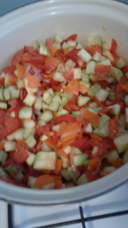 Значит: Кабачки кубиками, морковь полукольцами тоненькими, помидоры полукольцами, лук полукольцами