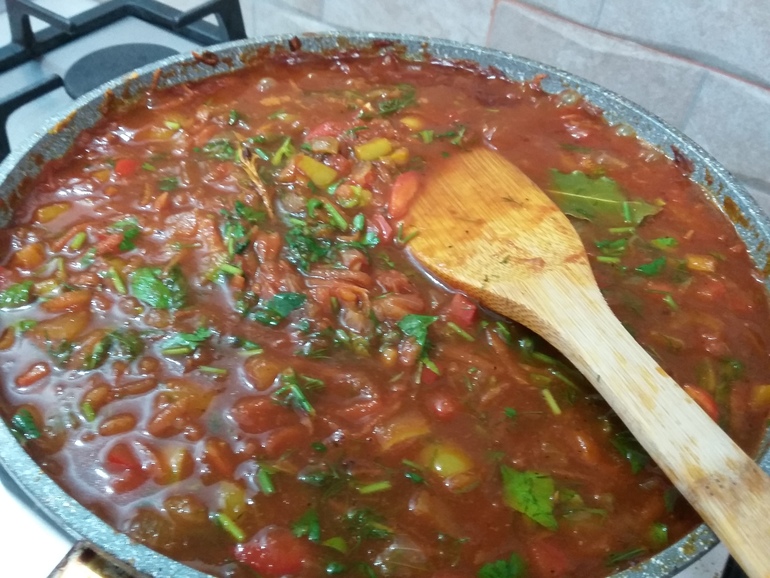 Болгарский перец, помидоры, перчик чили (не переусердствуйте!) и сельдерей: