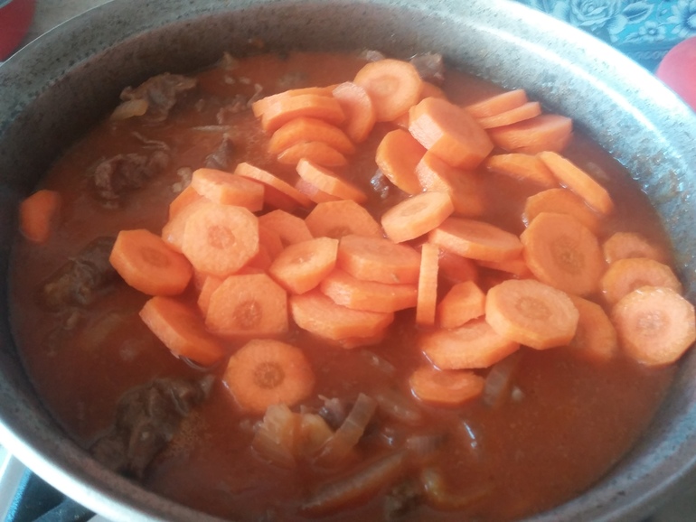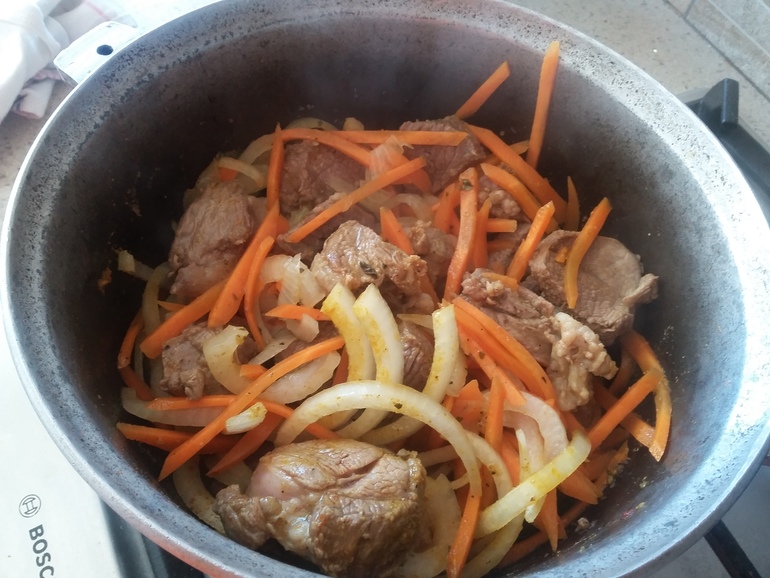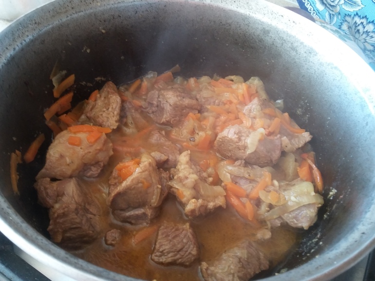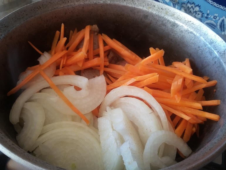 Выложить заправку в казан к мясу, добавить морковь: