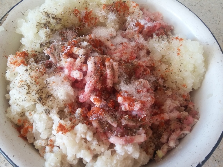Смолоть мякоть баранины с курдючным жиром и луком. Добавить соль, черный перец, паприку (опционально):