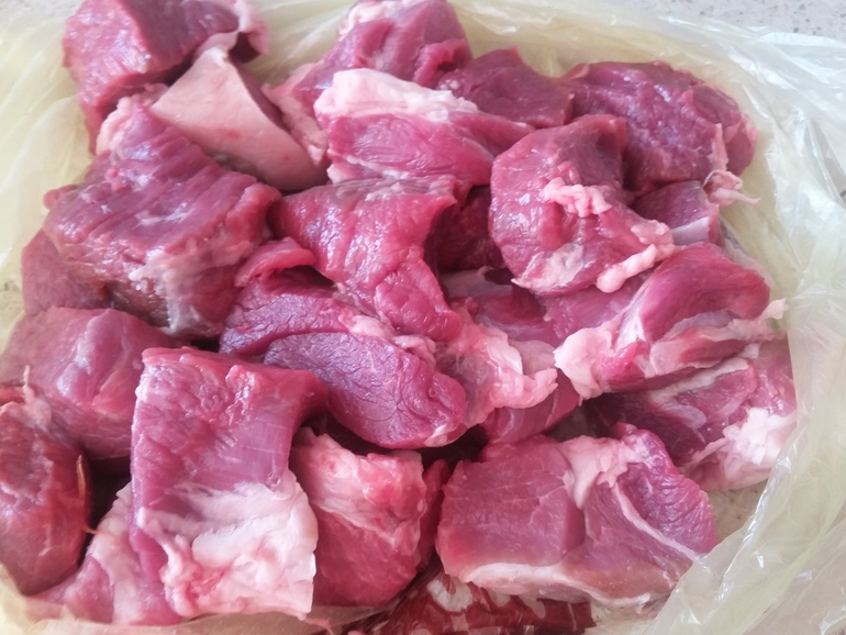 Мякоть баранины нарезать небольшими кусочками: