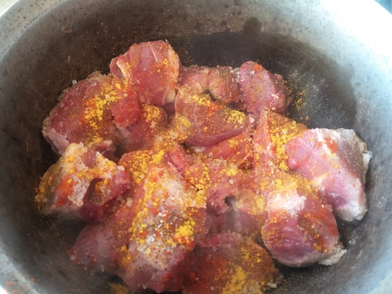 Обжарить мясо, добавив куркуму, соль, черный перец, паприку: