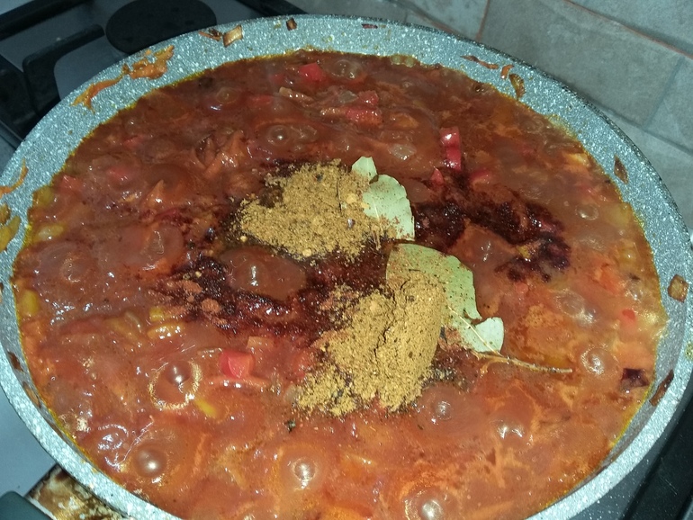 Добавить специи - красный и черный перец, лавровый лист, соль, :