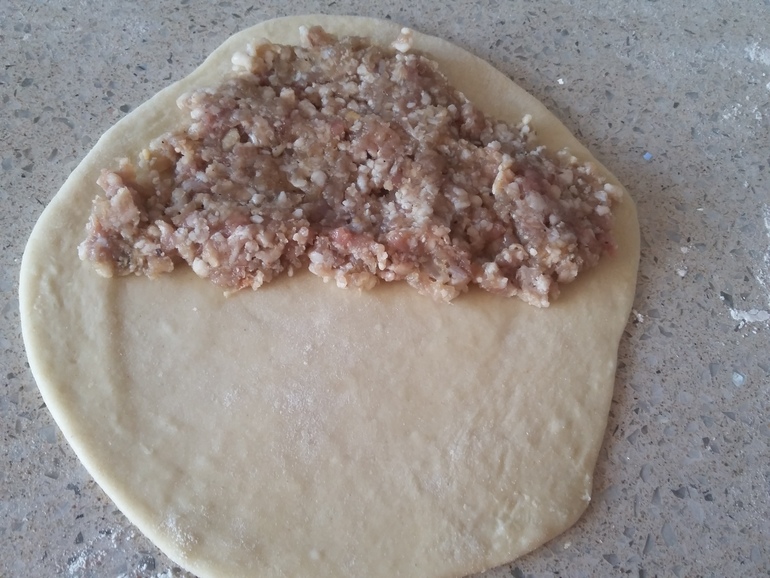 На половинку лепешки выложить тонкий слой мяса: