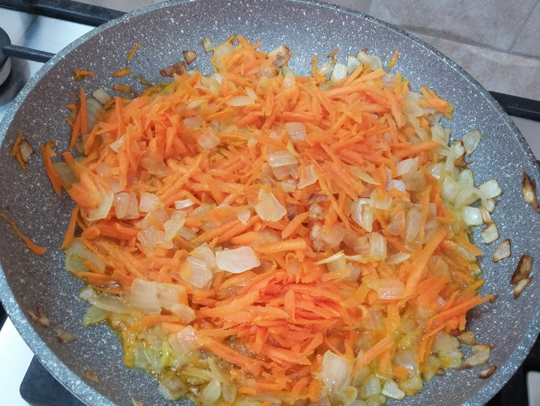 Добавить лук и морковь и накрыть крышкой: