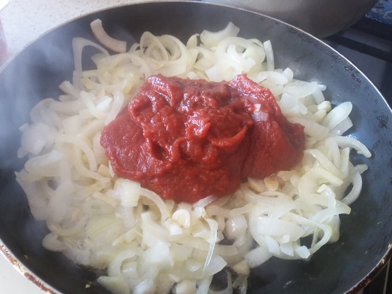 Обжарить на растительном масле, добавить томатную пасту: