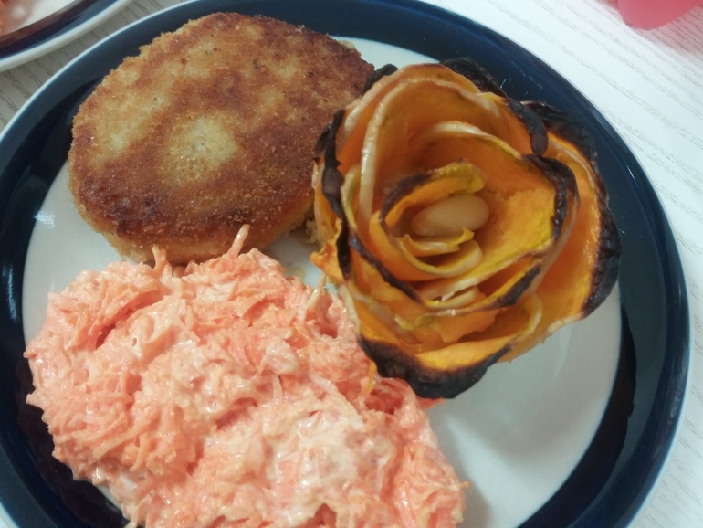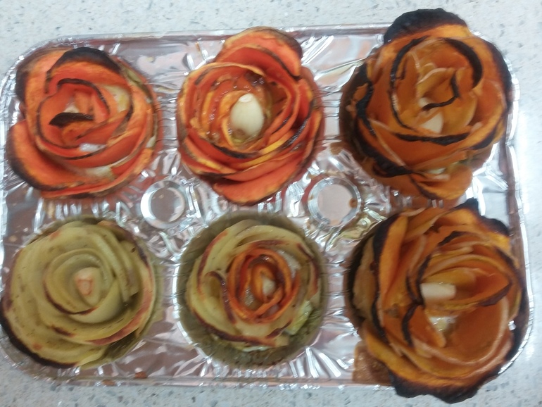 Готовила такие розы везде и из разных овощей. В Кацрине они были из картошки, в Хайфе делала из батата, кабачка, тыквы. Овощи нашинковать или тоненько нарезать пластинками: