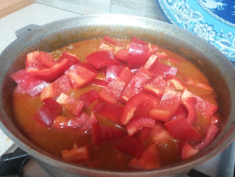Томить на маленьком огне до готовности мяса. Затем добавить нарезанный болгарский перец: