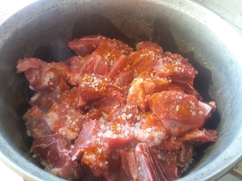Нарезать говядину небольшими кусочками, обжарить в казане с добавлением соли и паприки: