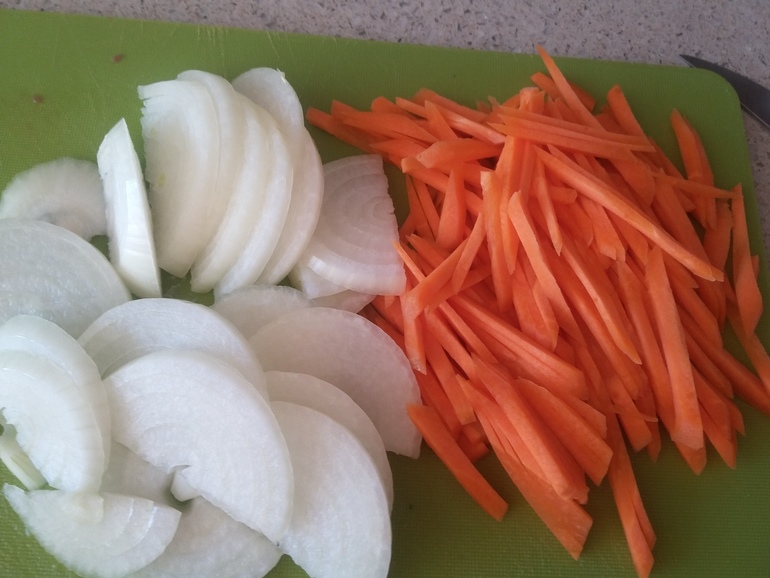 Нарезать лук, нашинковать морковь: