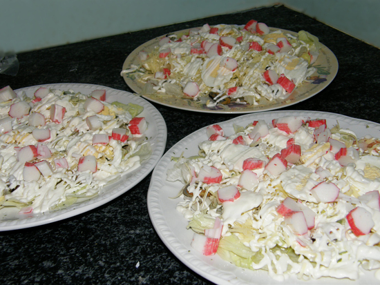 5. Далее по всему периметру тарелки кладём мелко потёртый сыр, на него укладываем крабовые палочки и снова делаем сетку из майонеза.