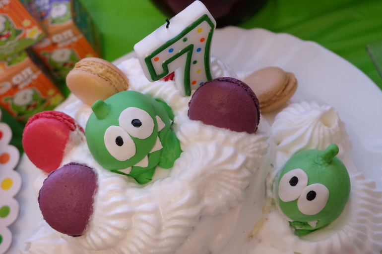 В оформлении использованы самолепные Ам-Нямчики, покупные макаруны и 1 пироженое "Пчёлка"