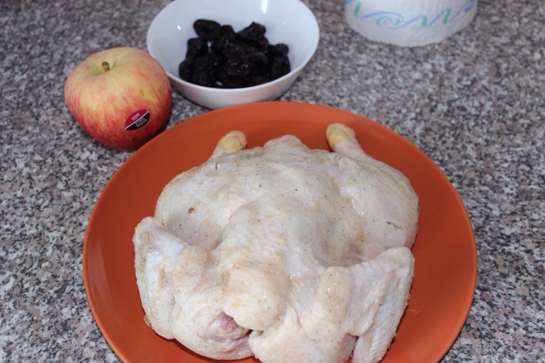 Внутрь тушки положила чернослив и яблоко, это придаёт сочность и слегка сладковатый вкус