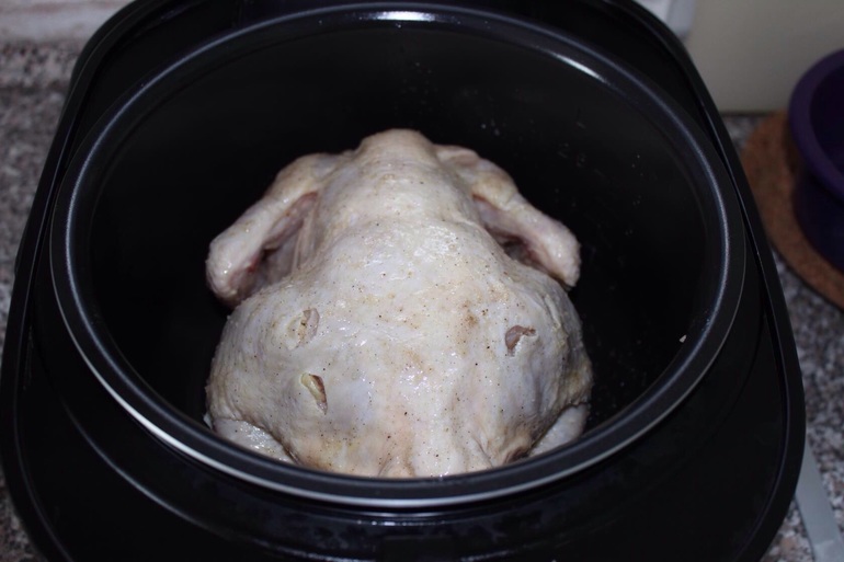 Курочку укладываем в мультиварку грудкой вниз, смазывать чашу не надо