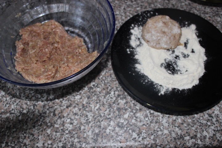 Трём кабачёк на мелкой тёрке и хорошо отжимаем сок, так же измельчаем лук на крупной тёрке и смешиваем лук, кабачёк, фарш и специи, я не добавляю яиц, тк с ними котлеты не такие нежные, из фарша делаем котлеты и обваливаем их в муке