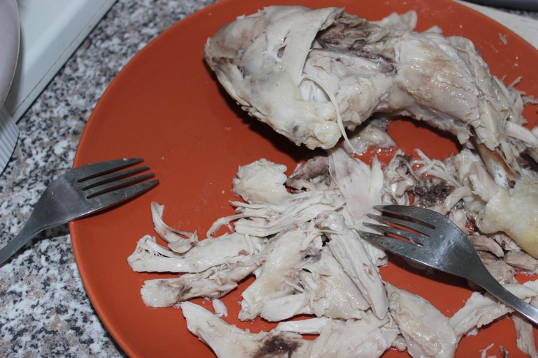 Достаём окорочка и снимаем мяса, это удобно делать двумя вилками