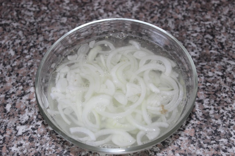 Нарезаем лук и заливаем горячим бульоном, что бы убрать горечь и сделать его более мягким